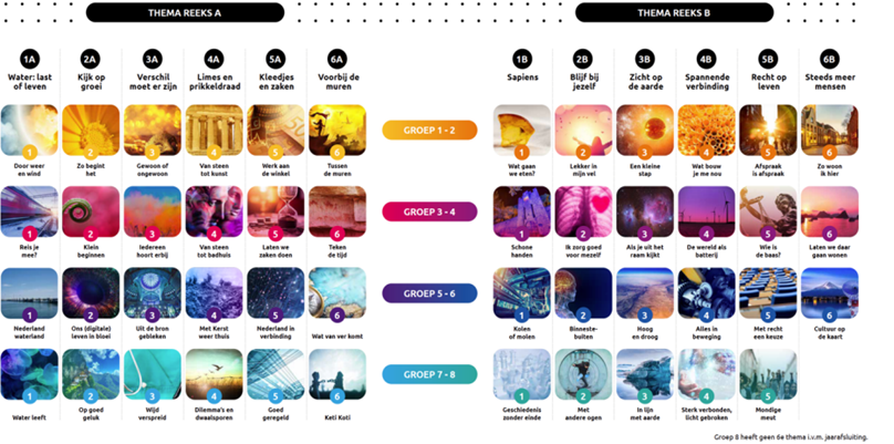De thema’s van het NKC zijn opgedeeld in een A-lijn en een B-lijn. Iedere lijn bevat zes thema’s die elkaar jaarlijks afwisselen. De gehele school werkt tegelijkertijd gedurende het ene jaar aan dezelfde thema’s van de A-lijn en in het volgende jaar aan dezelfde thema’s van de B-lijn. Binnen ieder thema zijn er subthema’s die per twee leerjaren gegeven worden. Deze structuur zorgt ervoor dat alle groepen op hetzelfde moment, op passend niveau, werken aan kennisopbouw binnen eenzelfde thematische context.